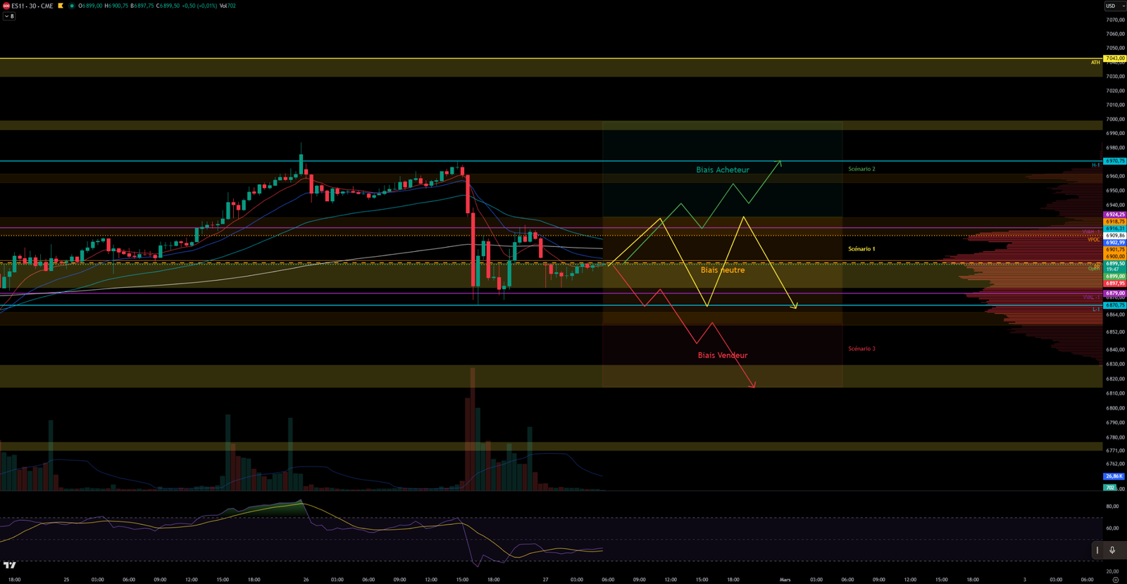 Scénario 1 🟡: Sur rejet sur la zone de résistance des 6920-6930, le prix pourrait consolider dans la zone des 6870 (Plus bas de la veille) et 6930