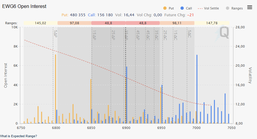 Les options nous montrent un certain équilibre dans les zones d’intérêt. Nous avons des zones de calls sur les 6900, 6950 et 7000 et des zones de puts sur les 6850 et les 6800.