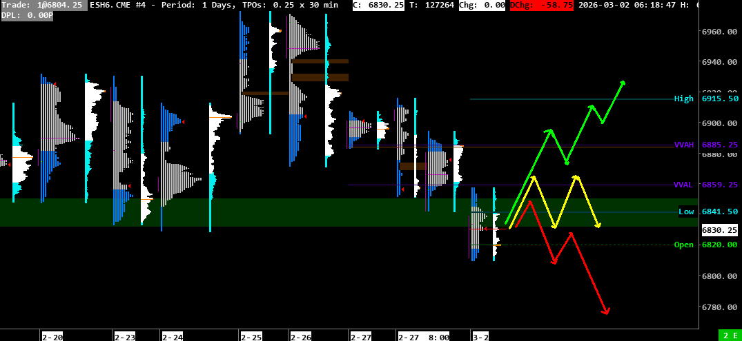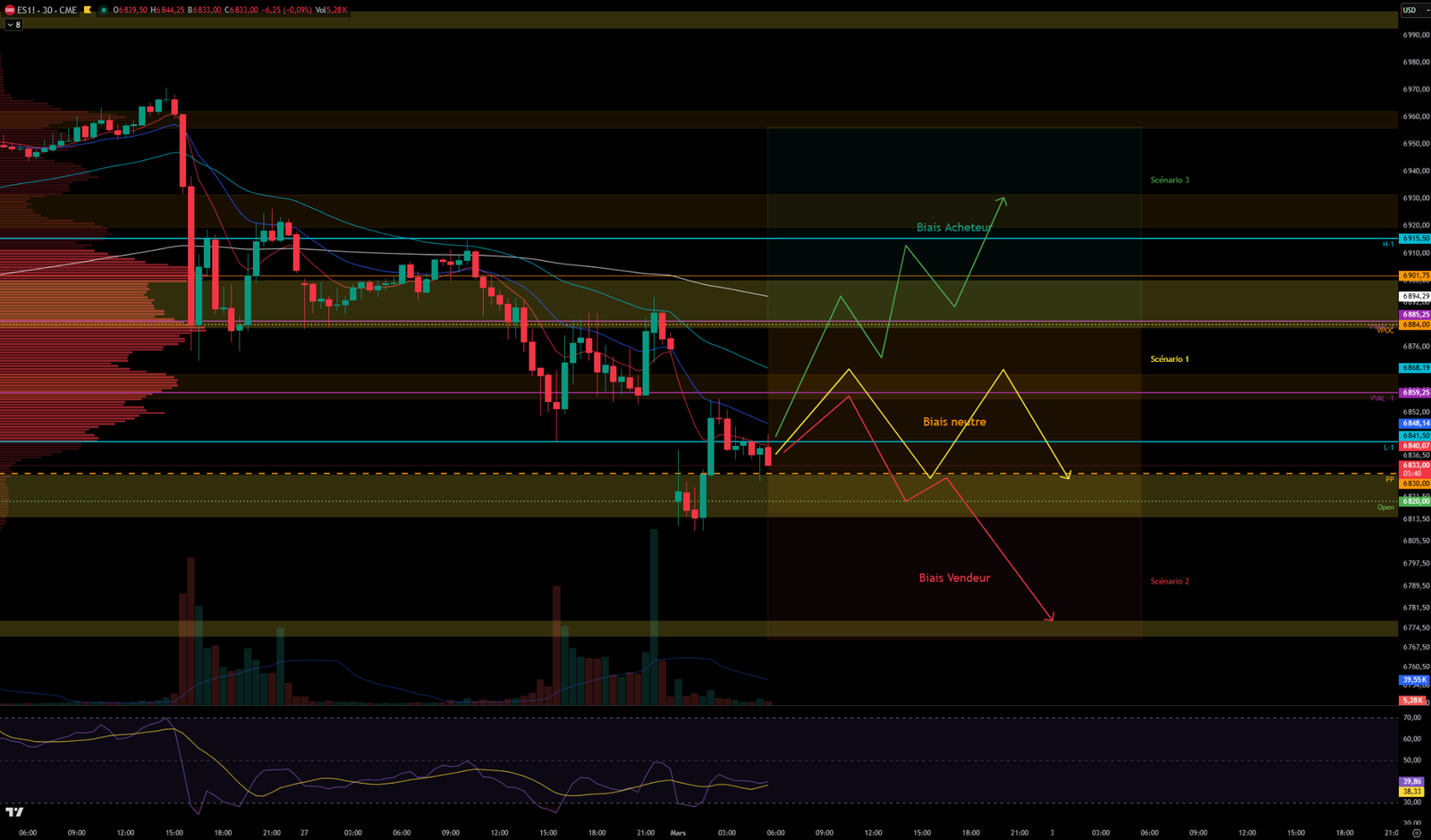 Scenario 3 🟢: Upon a break of the 6857-6866 resistance zone, the price could fill this morning’s bearish GAP between 6857 and 6873 and target the 6883-6900 resistance zone, which will be difficult to cross given Friday’s VPOC and VVAH. If successful, it could target the 6920-6930 resistance zone.