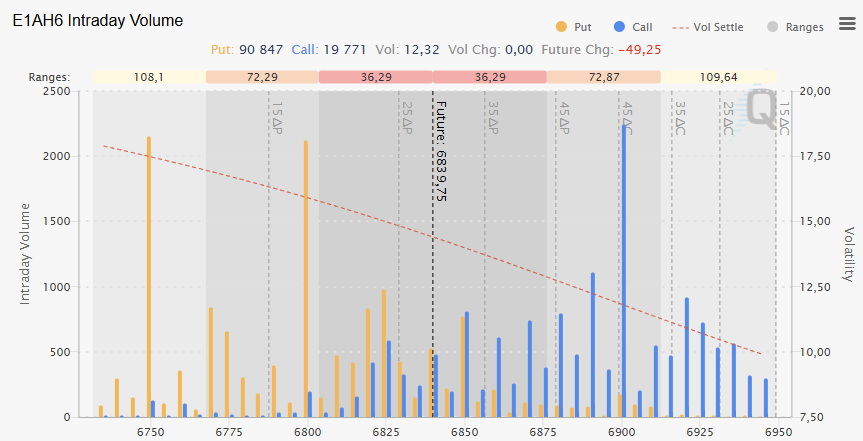 On the options table, we observe a large call zone at 6900 and put zones at 6800 and 6750. The market could navigate between these boundaries today.