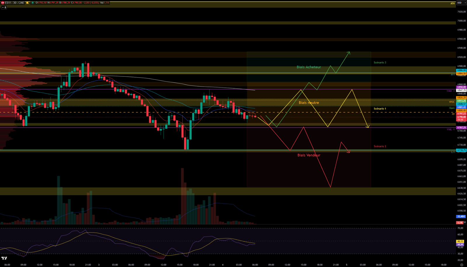 Scenario 1 🟡: On a rejection at the 6771-6777 support zone or at VVAL-1 at 6767, price could consolidate within the value area between 6767 and 6850.