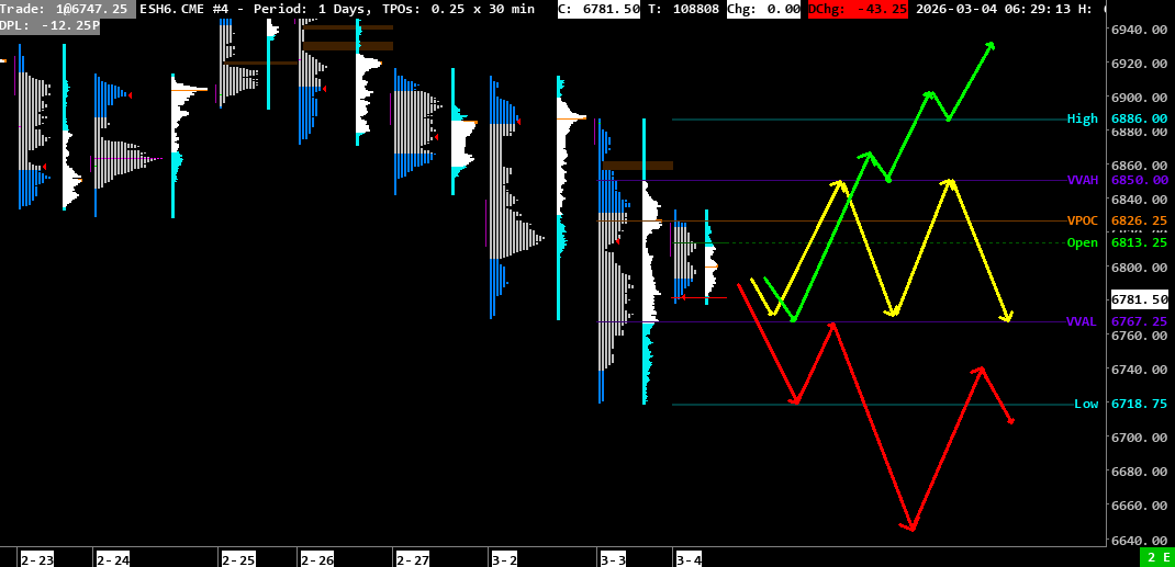 Scenario 2 🔴: On a break of the 6771-6777 support and confirmation with a break of VVAL-1 at 6767, price could continue lower and target the 6715-6720 area.