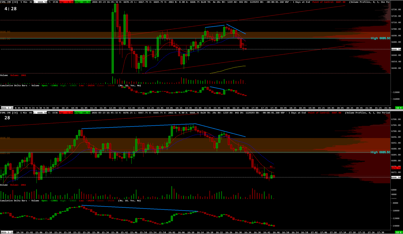 The market rallied after an announcement on Iran sent the index soaring. The price repeatedly tested the 6685-6695 resistance, and Friday’s high at 6685.50.