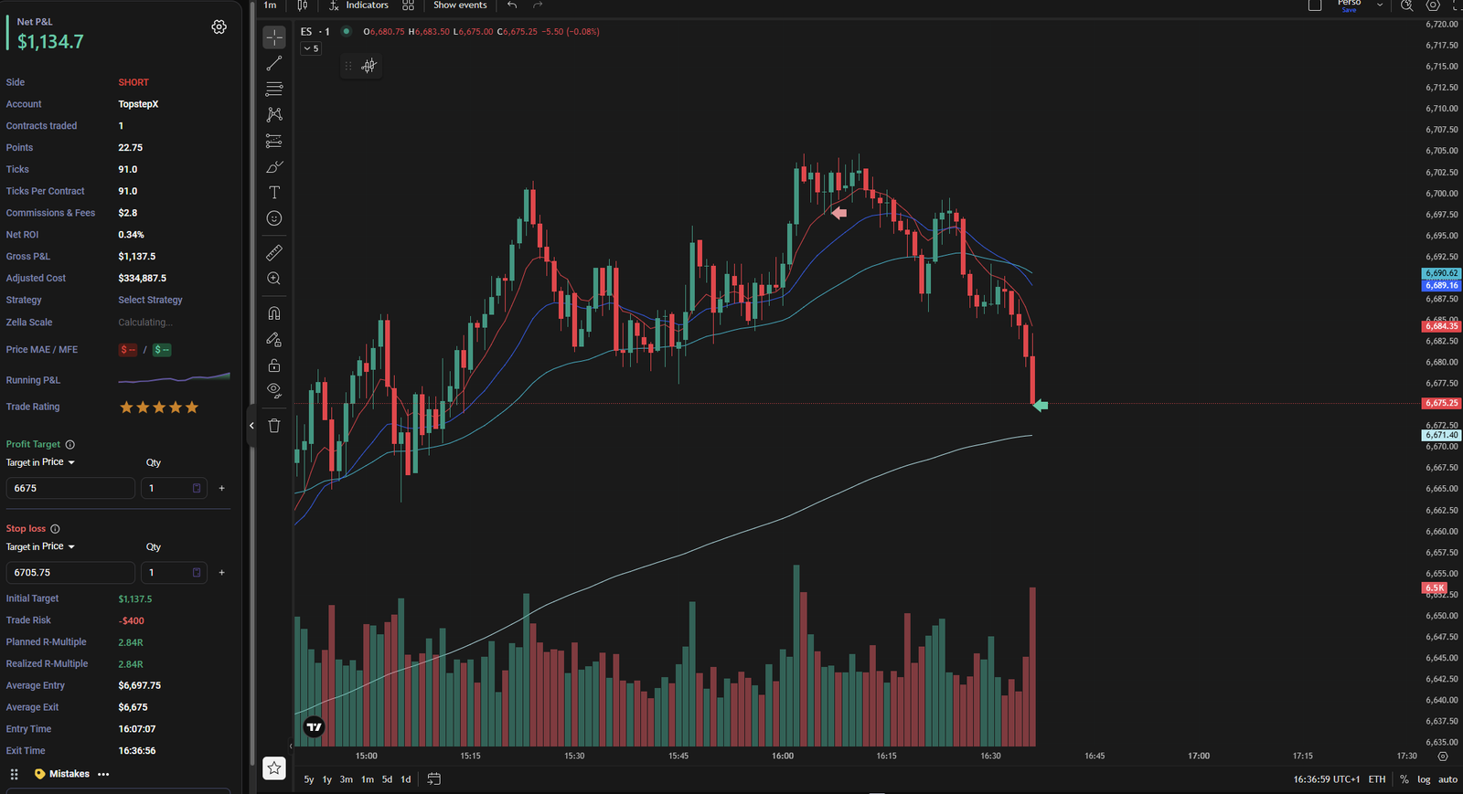 Position entered with one lot at 6697.75, a bit premature, and SL placed behind the high of the last candle at 6705.75.