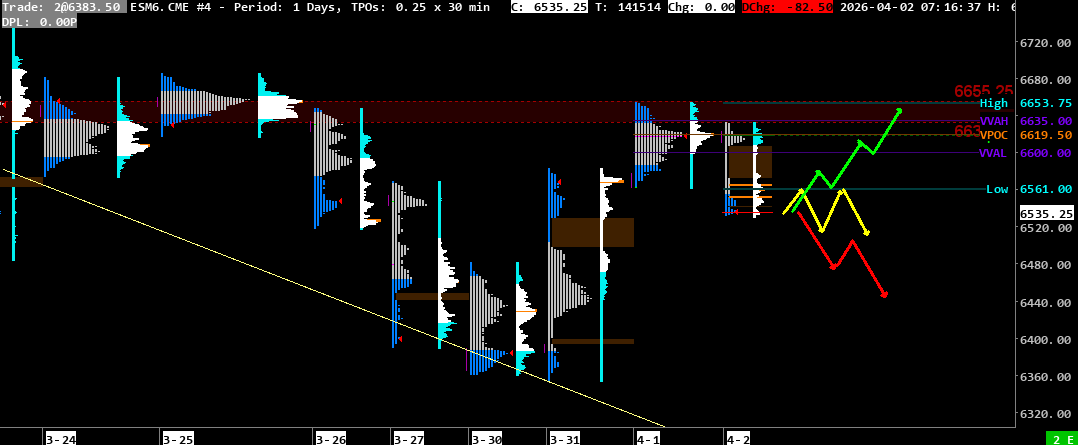 Scenario 2 🟢: Upon a break of the previous day’s lows at 6561, the price could resume its uptrend and seek to reintegrate yesterday’s value area above 6600 and toward 6635, then target yesterday’s high at 6653.