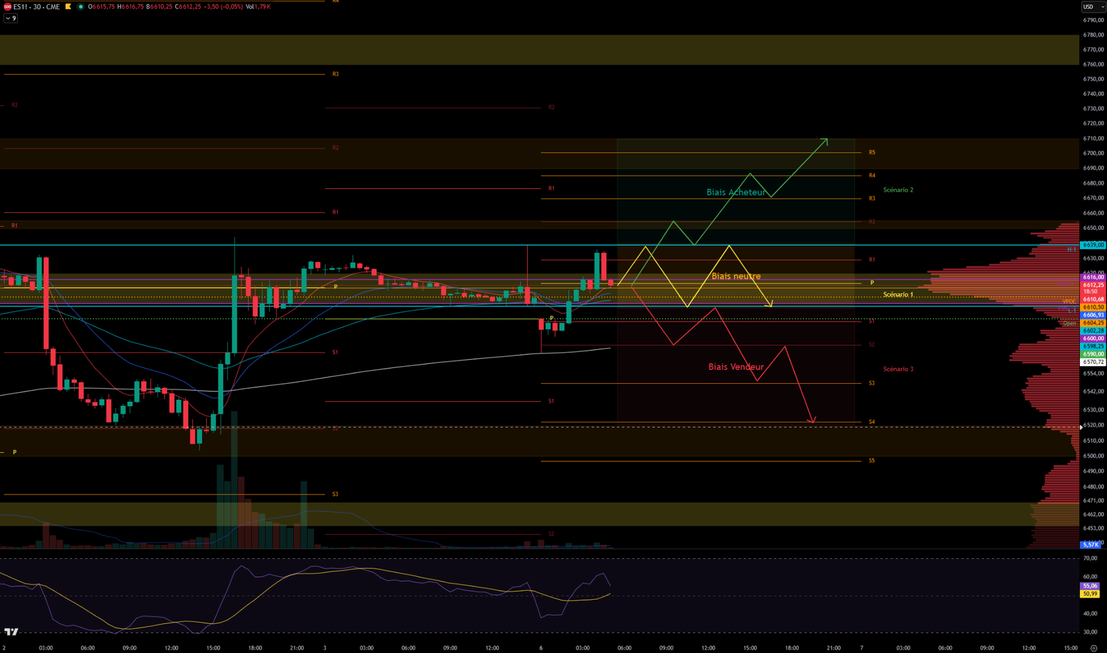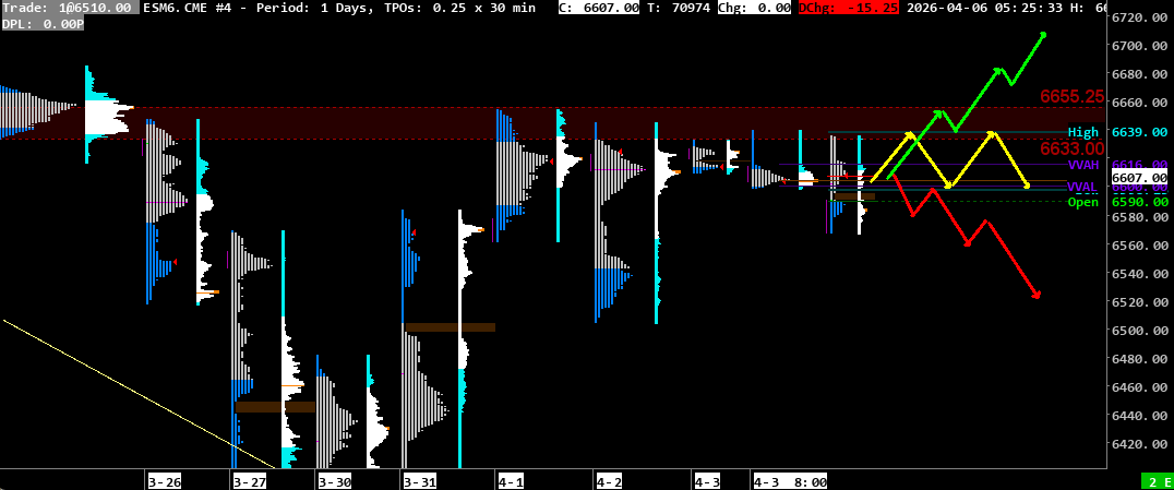 Scenario 1 🟡: Upon rejection at Friday’s high of 6639, the price could consolidate in Friday’s value area at 6600.
