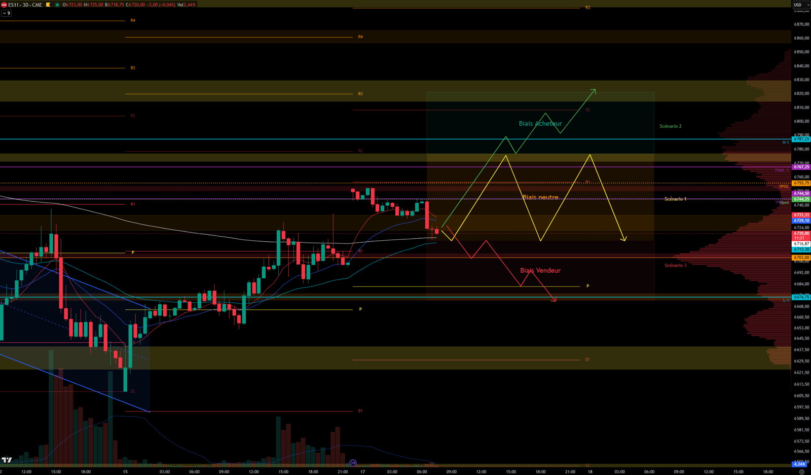At the US open, buyers maintained control and attempted to push the price higher but were stopped at the 6770-6775 resistance. The price then consolidated throughout the afternoon between the 6722-6733 support and the 6770-6775 resistance. This morning, the index opens in zone 1 at 6744.25, on VVAL-1 and on the 6750-6755 resistance zone. Sellers are in control and have pushed the price below the 6722-6733 support zone. Indicators are predominantly bearish for now, as is the cumulative delta.