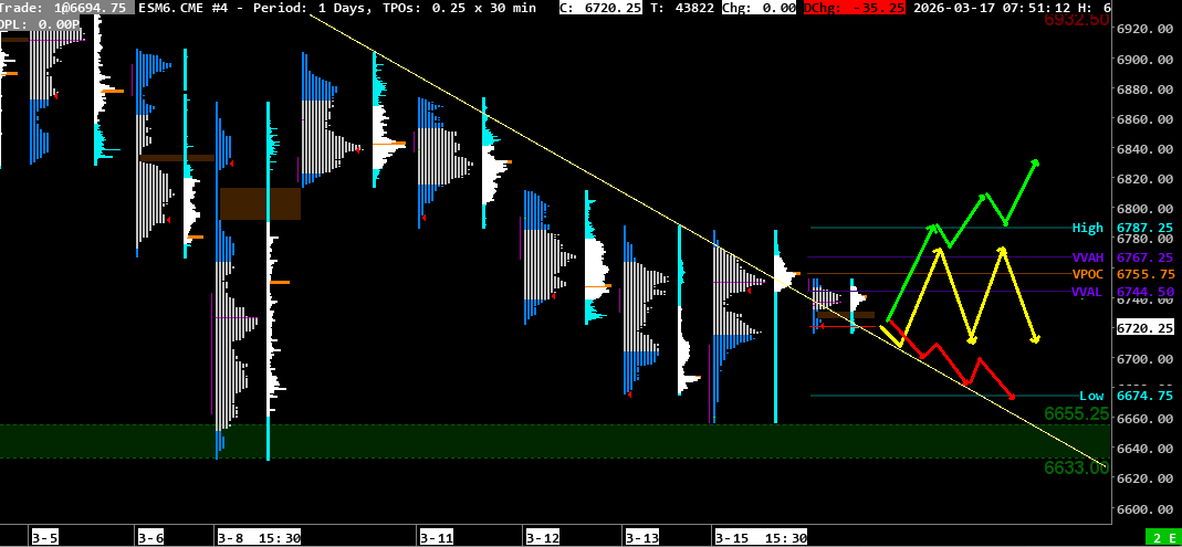 Yesterday, the S&P500 opened in the lower zone 3 but quickly re-entered the previous day’s value area. Buyers took control and pushed the price up to the 6722-6733 resistance, where it remained for a good part of the morning before breaking this resistance prior to the US open.
