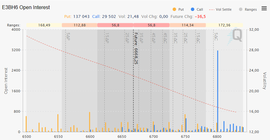 This morning, levels are higher than normal, and volatility remains at 24. Caution will be required when entering positions, and stop placement should be adjusted accordingly. In terms of options, we see significant call interest at 6800, which could attract the price but also cap it at that level.