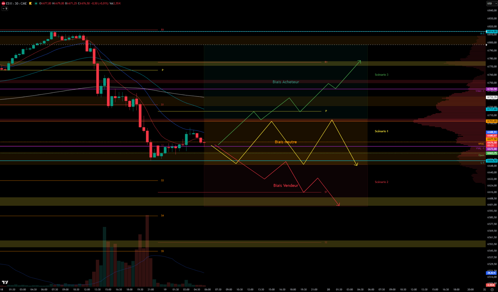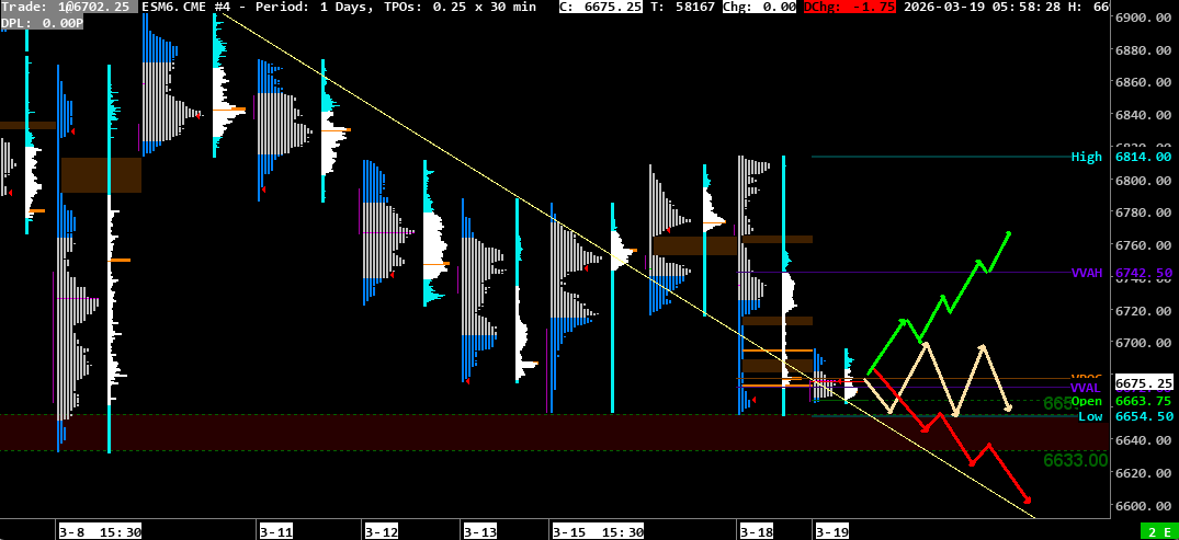 Scenario 1 🟡: On a rejection at the 6650-6665 support, price could consolidate between this area and the 6702-6706 resistance zone.
