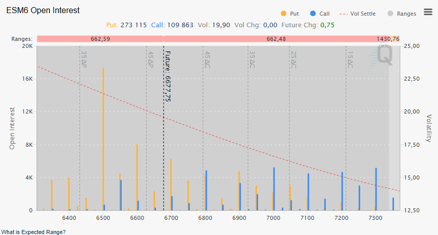 Price is currently consolidating above the 6650-6665 support zone, around the VWAP. In options, we can see strong put interest at 6600, which could set the day’s floor, and a call zone at 6800, thus defining the session’s boundaries.