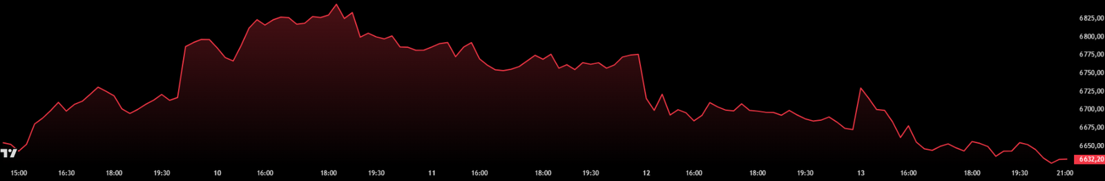 The price ended the week at the 6625-6640 support zone, right on the lower line of the descending channel and practically at the early week lows. This intersection between the descending channel and support could constitute a technical bounce zone before continuing its decline, unless the price manages to bounce enough to break the top of this channel.