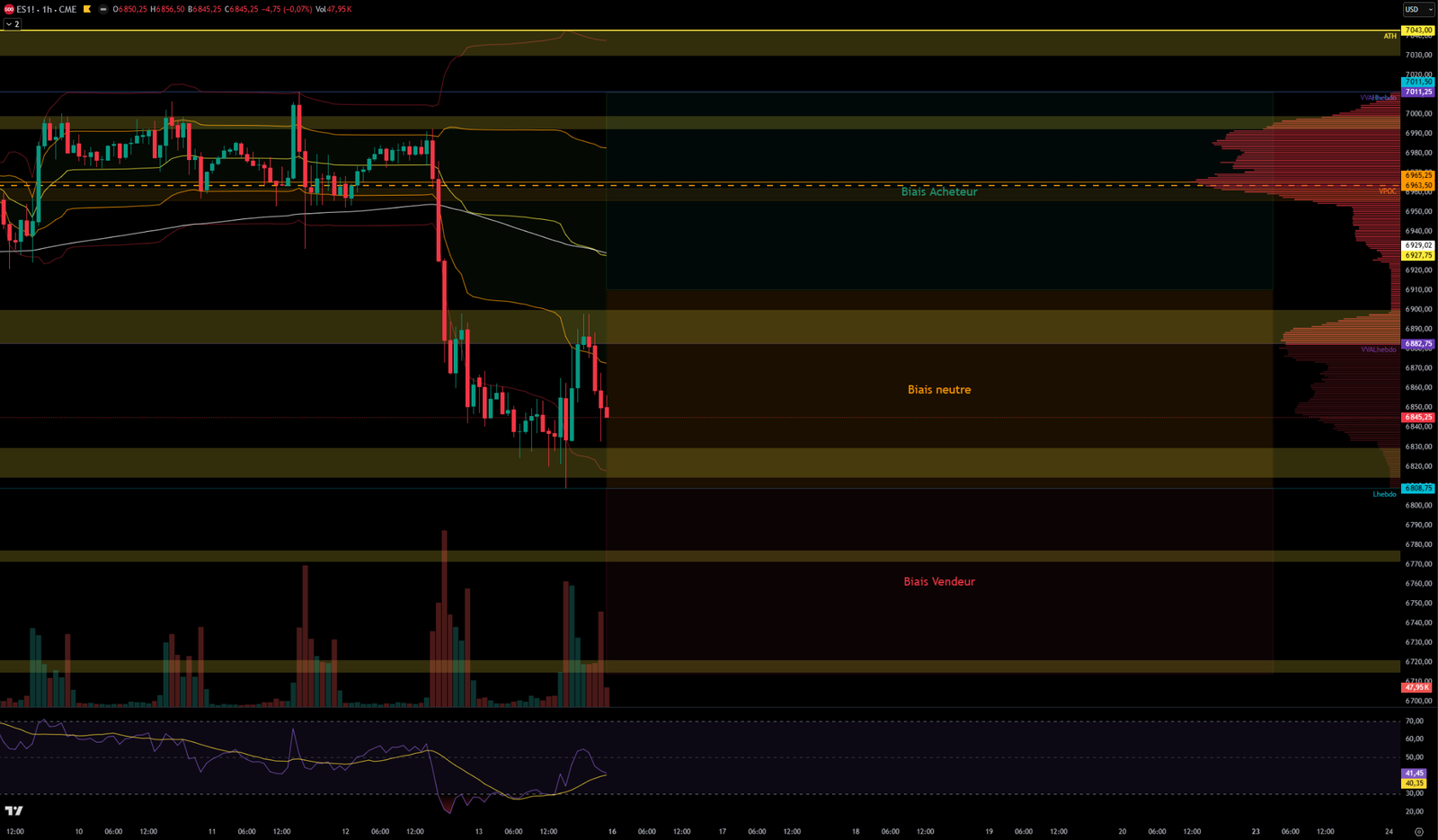 Une divergence haussière sur le RSI du graphique 1h avait été validée vendredi, mais rapidement invalidée, ce qui pourrait être le signe d’une poursuite de la tendance baissière. Pour espérer une éventuelle hausse du SP500, il faudra impérativement que le cours casse les 6900 et comble les deux single prints formés à 6900-6923 et à 6928-6953 (si le prix y parvient, il pourrait très rapidement remonter). La zone des 7000 reste également un gros mur que le cours semble avoir du mal à passer.
