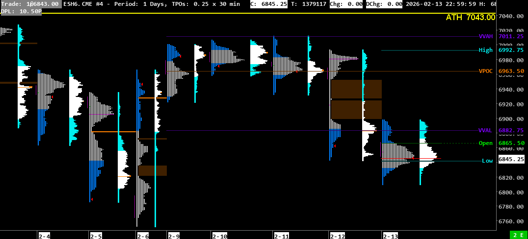 En ce début de semaine, le SP500 se trouvera entre une zone de support (6815-6830) en dessous de laquelle le prix a été rejeté par les acheteurs et un mur à 6900 formé par un gros single print et une grosse zone de résistance (6883-6900). Les zones d’options montrent de grosses zones de Puts à 6700 et 6750 et des Calls positionnés à 6850, 6900 et 7000. Les Low et les High de la semaine pourraient se situer entre les 6700 et 7000.