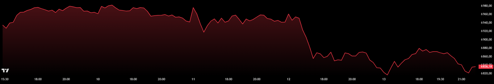Le cours a ensuite repris sa consolidation entre les zones précitées jusqu’à l’ouverture US de jeudi où le prix a complètement dévissé et a fortement chuté jusqu’aux 6900, puis aux 6860. En fin de semaine, l’indice est venu se poser sur la zone de support des 6815-6830 avec un rejet en dessous de cette zone vendredi et une tentative de rebond acheteur suite aux bonnes données de l’inflation US, mais le prix est revenu sur les niveaux moyens de la journée autour des 6845 où il a clôturé.