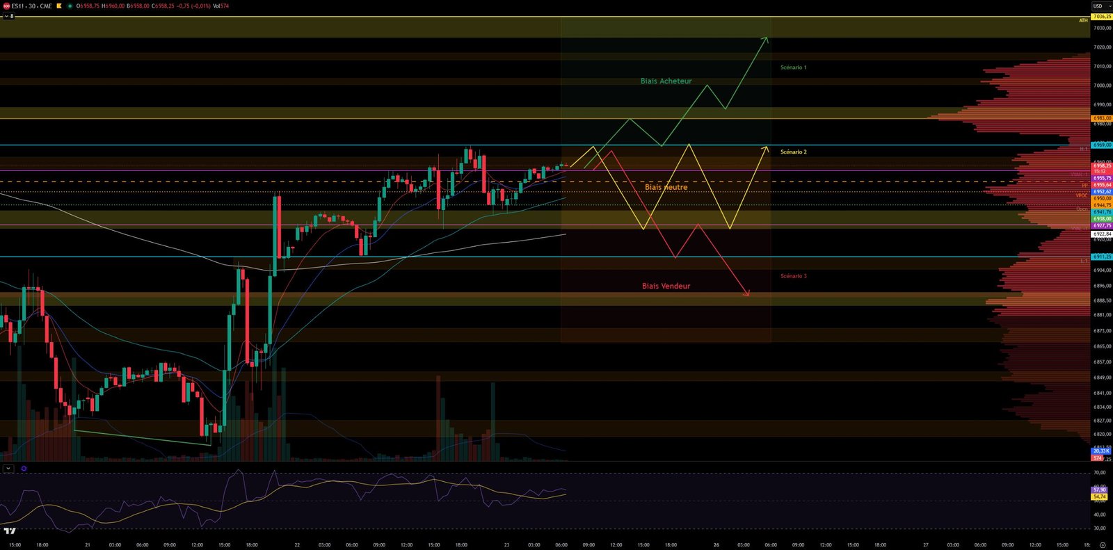 Scénario 2 🟡: Sur rejet sur le plus haut de la veille à 6969, le cours pourrait une nouvelle fois consolider entre les Zones des support/résistance des 6926-6942 et 6956-6963