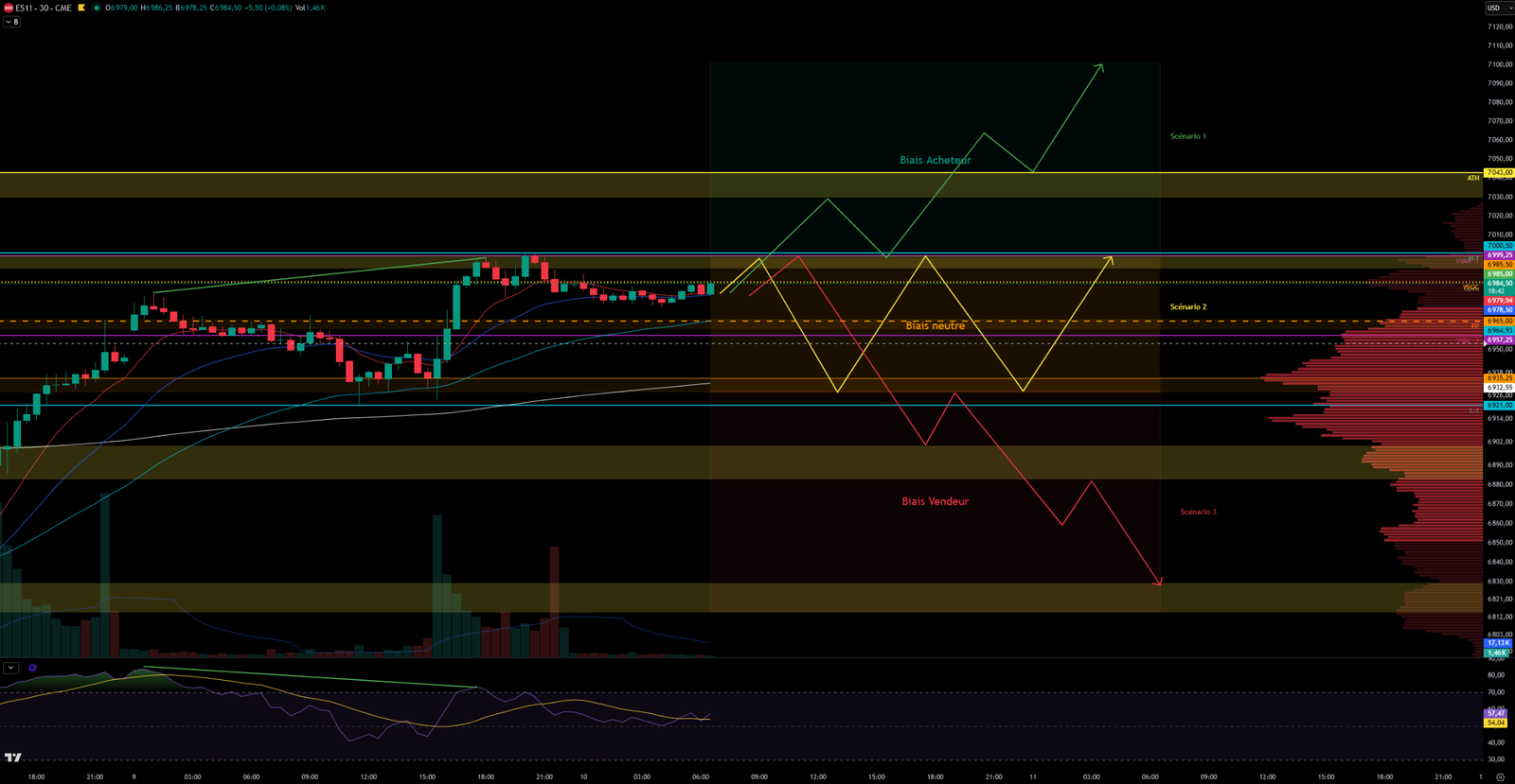 Scénario 1 🟡: Sur cassure de la VVAH-1 et de la zone de résistance des 6993-7000, le cours pourait s’installer durablement au dessus des 7000, la zone étant assez forte depuis la veille avec le plus haut de la veille, la VVAH et le niveau des 7000. De niveau formera un très bon support par la suite.