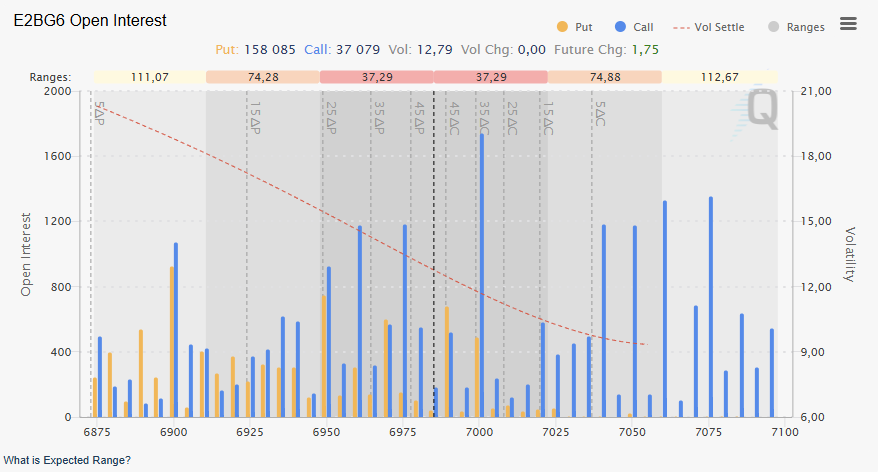 Aujourd’hui, le S&P 500 ouvre en zone 1, sur le VPOC de la veille. Le prix travaille ce niveau juste en dessous de la zone de résistance des 6993-7000 qui a bloqué le prix hier. Le delta est très légèrement haussier avec, comme hier, un volume pour le moment en dessous de la normale. Si les acheteurs veulent faire monter le prix, il faudra casser ce niveau des 7000 qui tient bien depuis hier. Le volume de calls sur ce niveau agit comme un aimant, mais constitue également une puissante résistance.