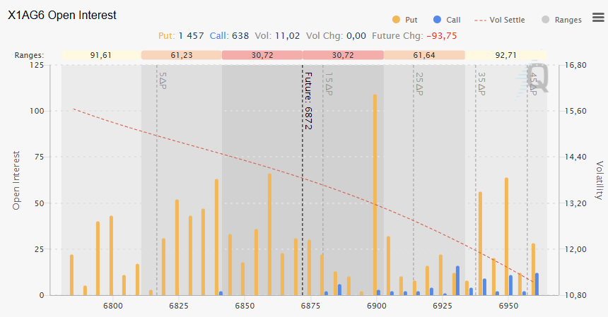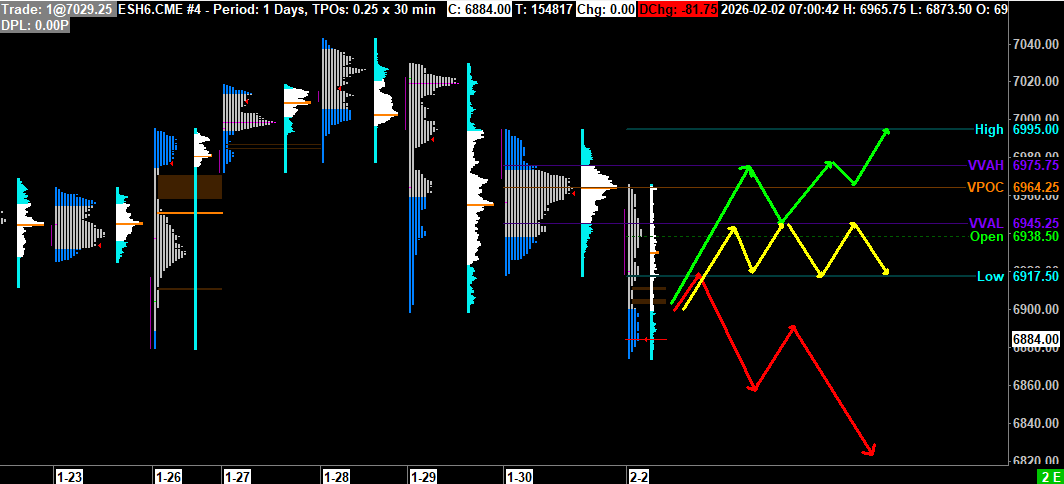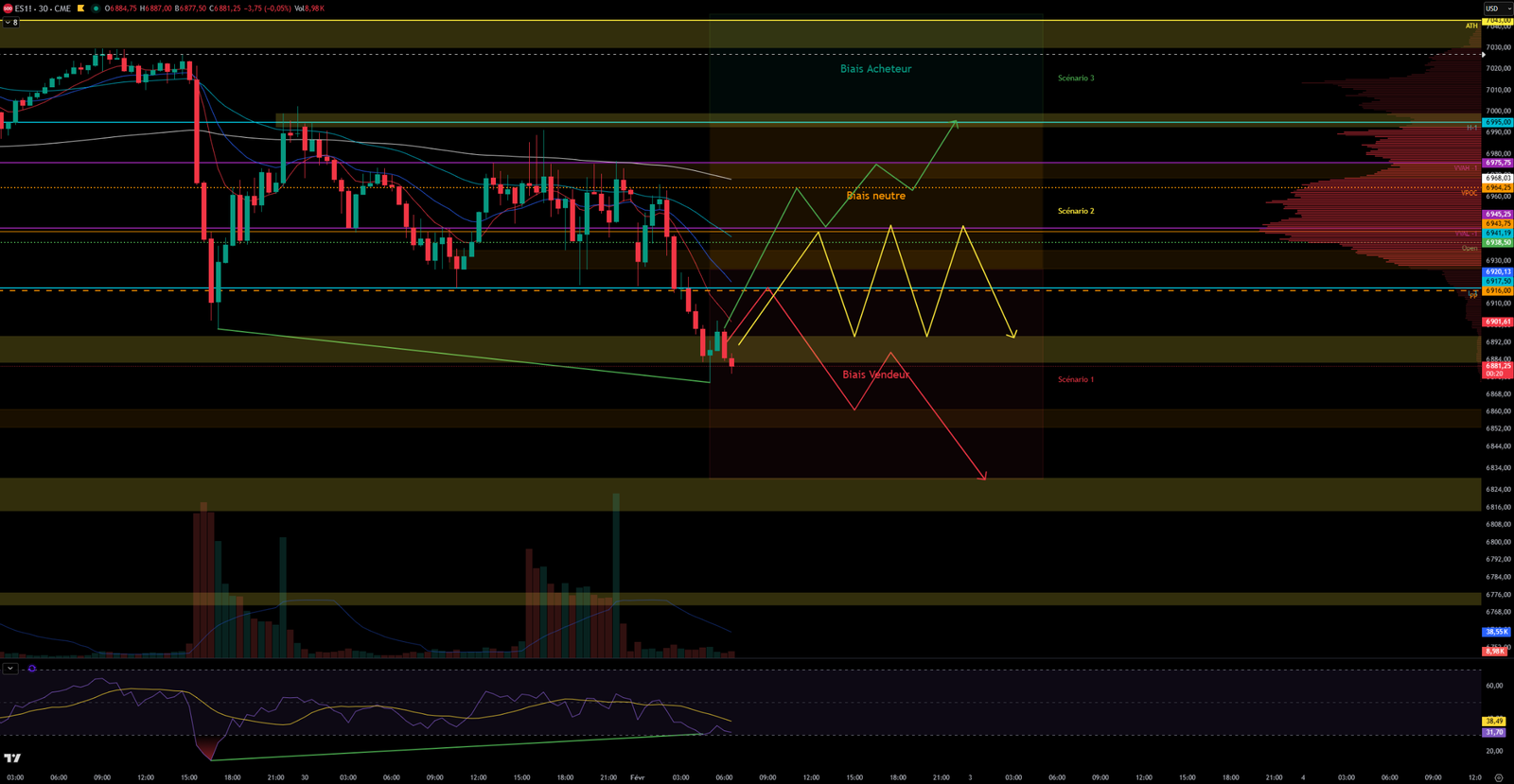 Scénario 2 🟡: Sur cassure du plus bas de vendredi à 6917 et rejet sur la VVAL-1, le cours pourrait consolider dans la zone des 6895 et 6917.