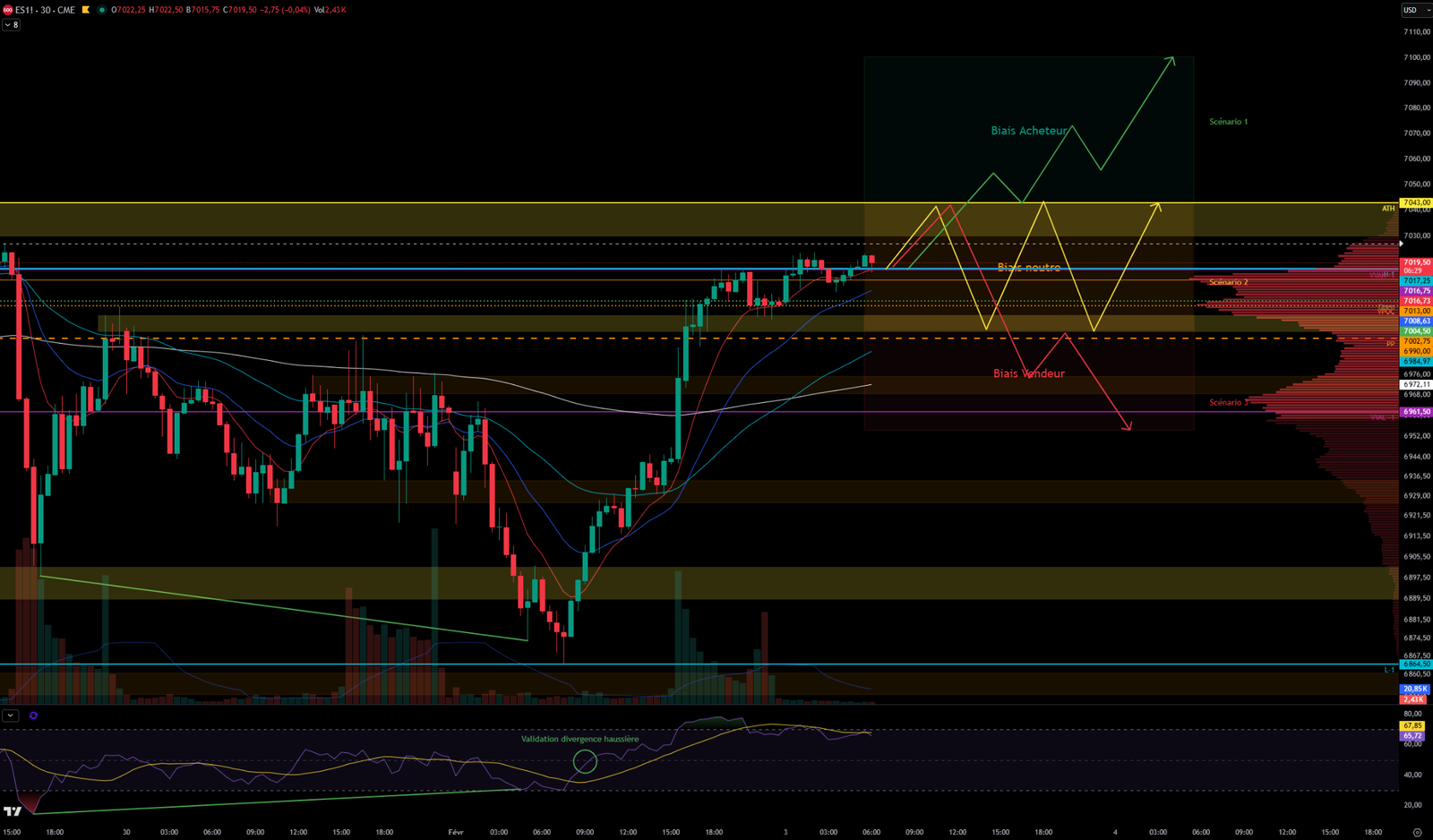 Scénario 1 🟢: Sur cassure de la zone de résistance des 7030-7043 et confirmation de cassure des 7050, le cours pourrait partir à la hausse et aller chercher les 7100.