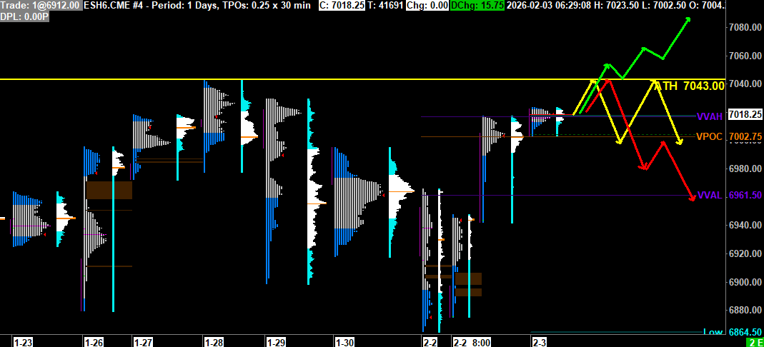 Scénario 3 🔴: Sur rejet sur la zone de résistance des 7030-7043 et cassure de la zone de support des 6992-7000, le cours pourrait repartir à la baisse et aller chercher les 6950, vers la VVAL-1.
