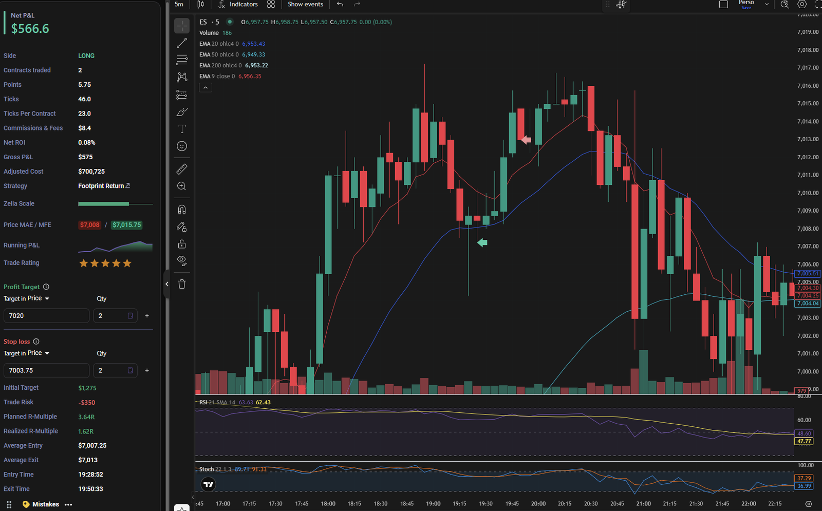 Prise de position avec 2 lots à la vente à 7014.75 avec un ordre limite juste en dessous du POC de la bougie signal. SL au-dessus de la bougie signal à 7017.50.